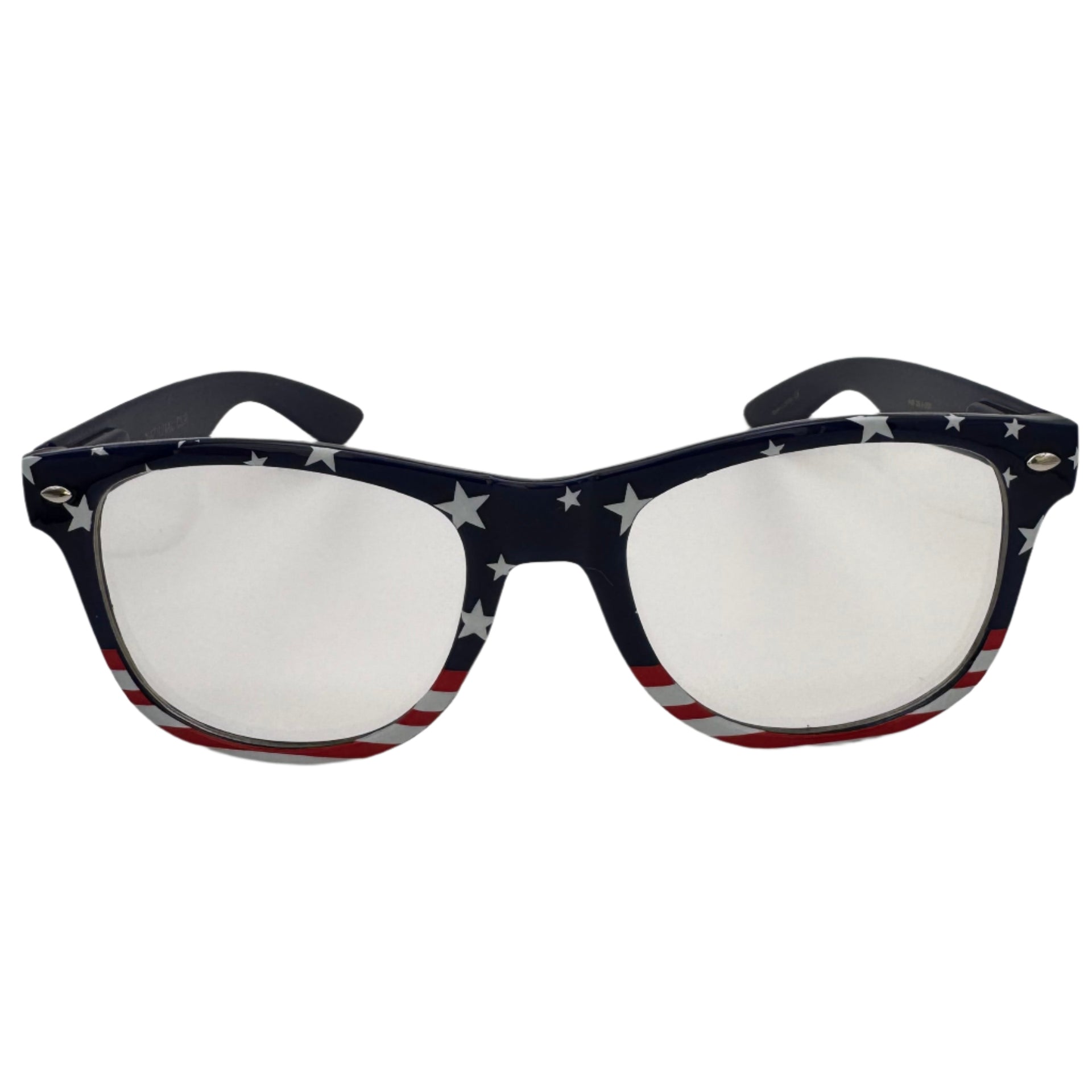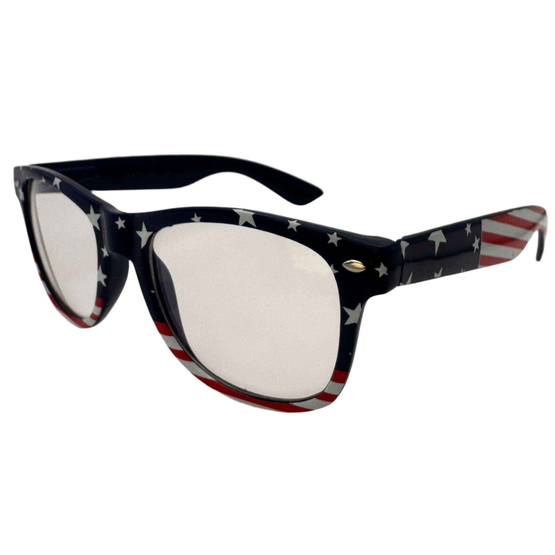 Experience patriotic style with our USA Flag Design Clear Lens California Classic Glasses. These novelty glasses feature a versatile unisex design and clear non-prescription lenses. Get ready for compliments and fun with this classic accessory. (USA Pride has never looked so good!)
