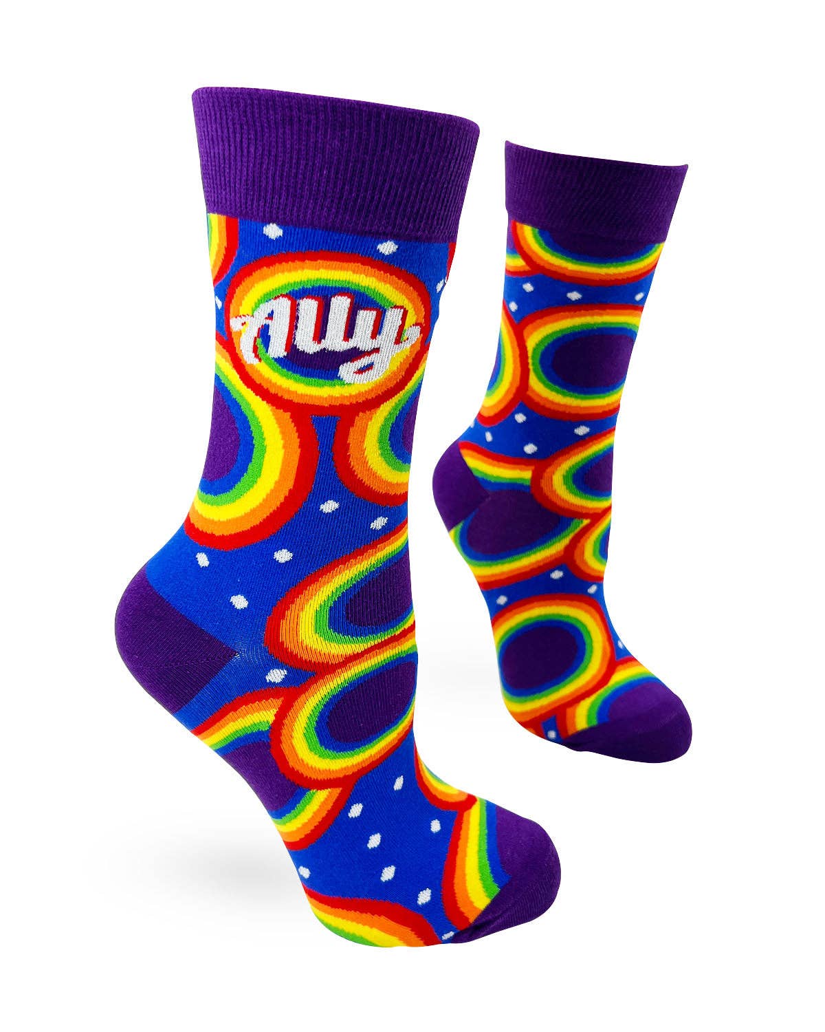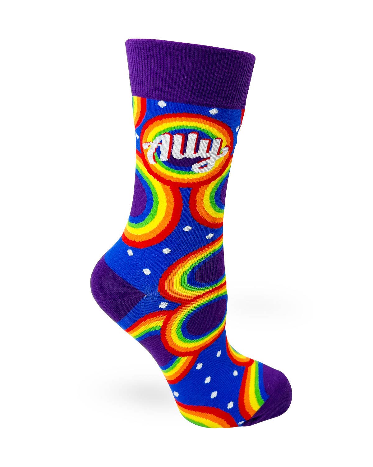 Ally Rainbow Women's Crew Socks. Perfect for LGBTQ pride events or showing your support for the LGBT community all year round. Stylish and comfortable! Fits ladies' shoe size 5 to 10. 80% Cotton, 15% Nylon, 5% Spandex. Easy Care - Machine Wash.