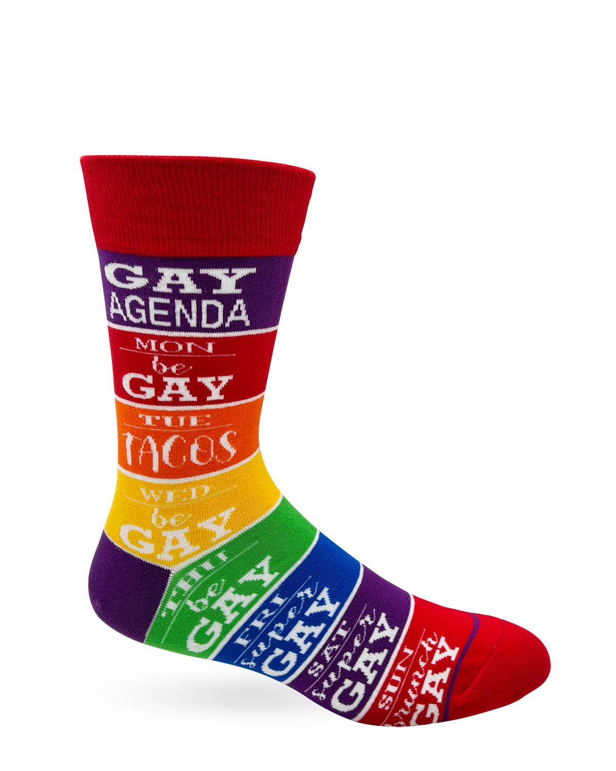 Men's novelty crew socks "Gay Agenda." Stylish and comfortable! Fits men's shoe size 7 to 12. 80% Cotton, 15% Nylon, 5% Spandex. Easy Care - Machine Wash.